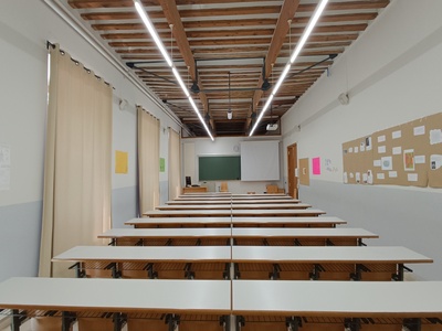 - Aula 1 con capacidad para 40 personas. Dispone de altavoces,cámara, proyector y pantalla . El moviliario no se encuentra anclado al suelo.Planta baja.
