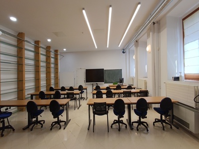 - Aula 10 con capacidad para 25 personas y moviliario que no se encuentra anclado al suelo. Dispone de pantalla táctil , veleda y ordenador. Planta baja.