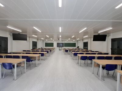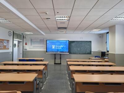 - Aula 0.8 con capacidad para 160 personas. Disponen de pantalla táctil.