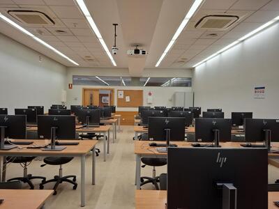 - Aulas 14 y 31 con capacidad para 56 personas. Disponen de ordenador, cámara, proyector y pantalla de proyección.