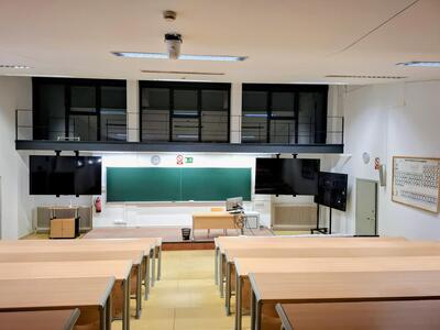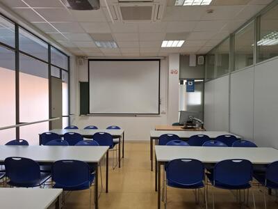 - Aulas 14 y 24 con capacidad para 70 y 72 personas. Disponen de ordenador y pantalla de proyección.