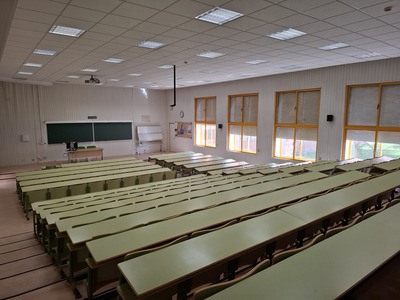 - Aulas 1 y 6 con capacidad para 203 personas. Disponen de equipo de megafonía con micrófono inalámbrico, ordenador, proyector y pantalla de proyección.