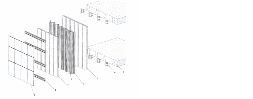 Fig.: Muestra en axonometría las partes constitutivas de la nueva solución de fachada ventilada